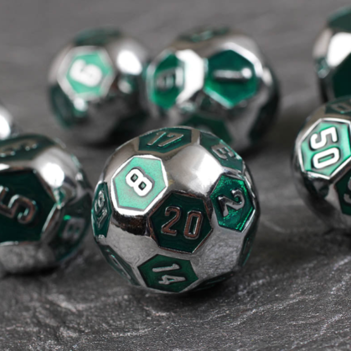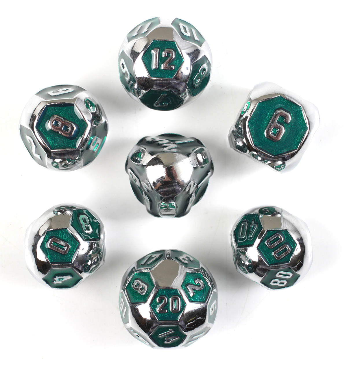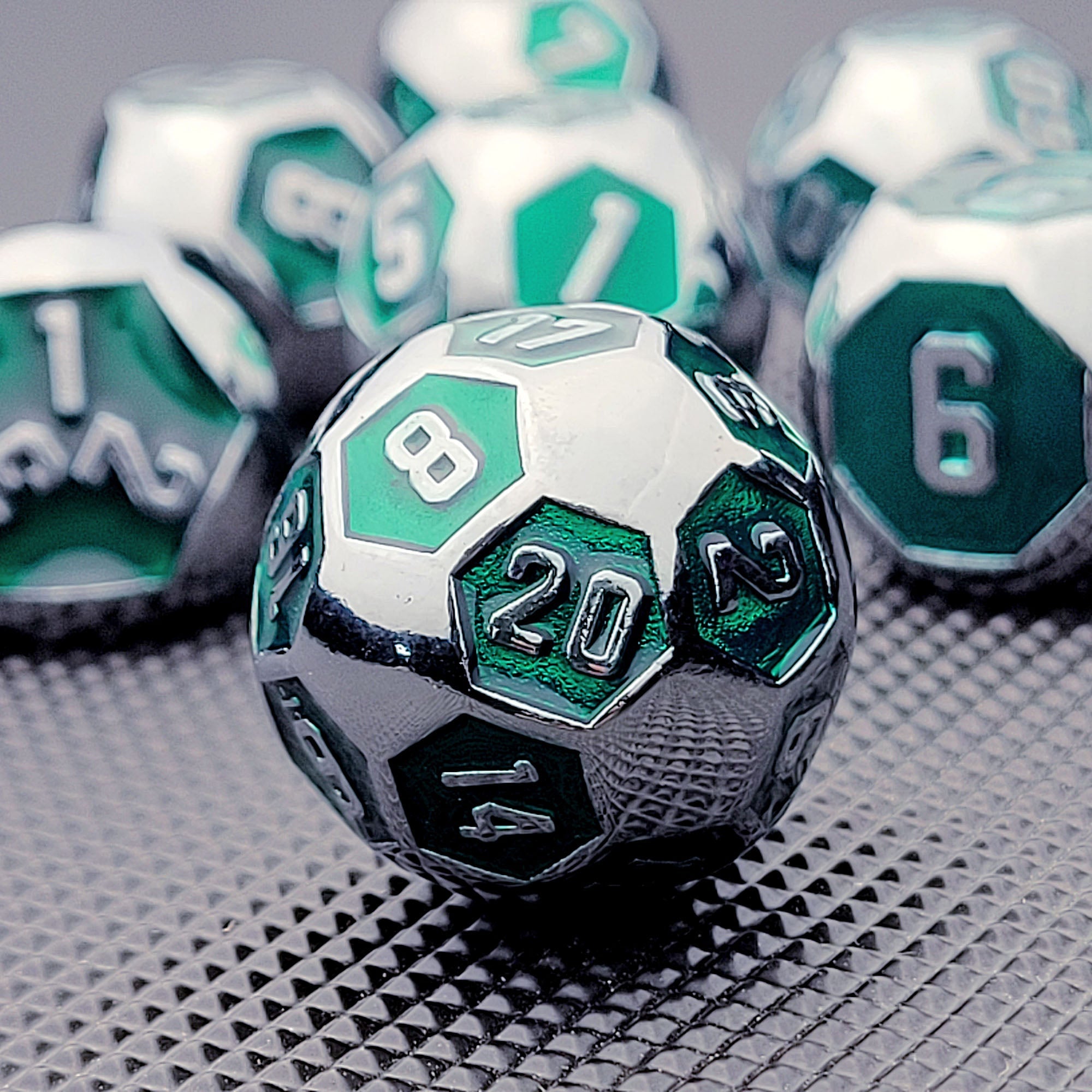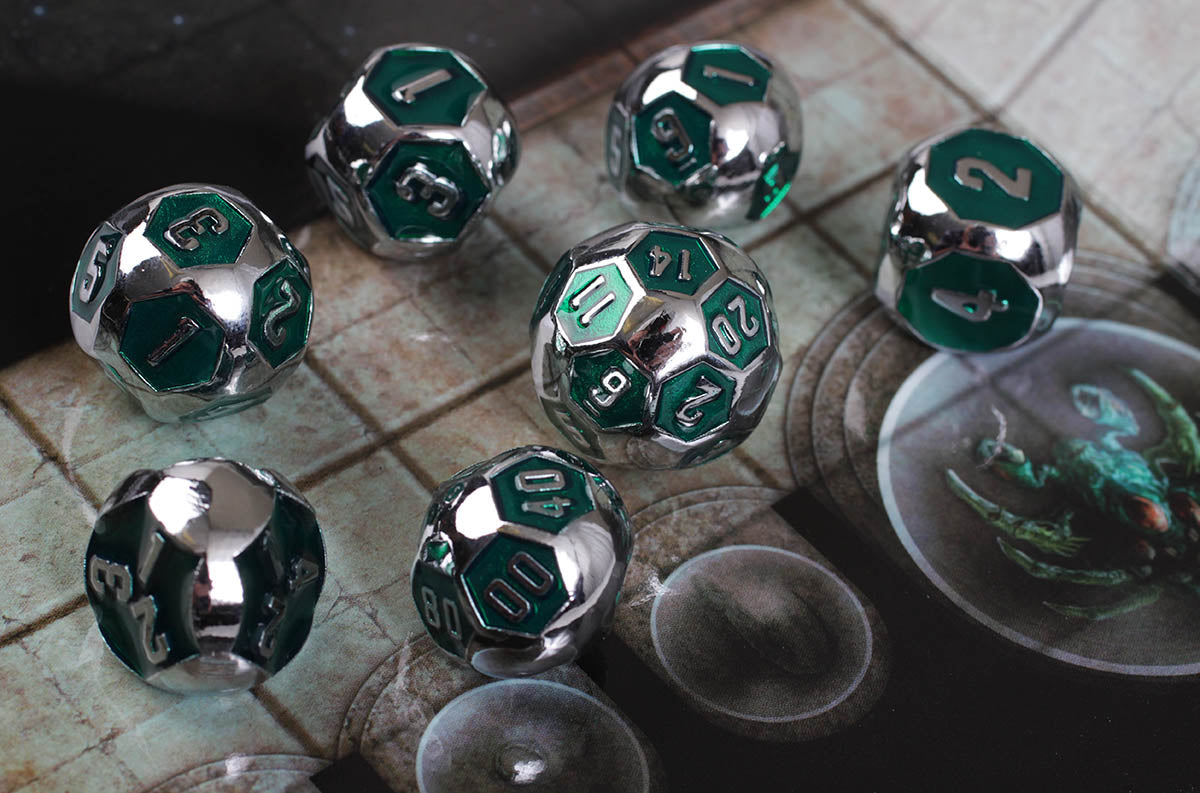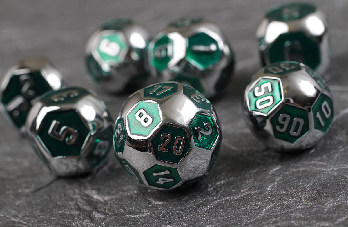 Each die in this set in uniquely rounded and comes in a polished silver finish a reflective green inlay.